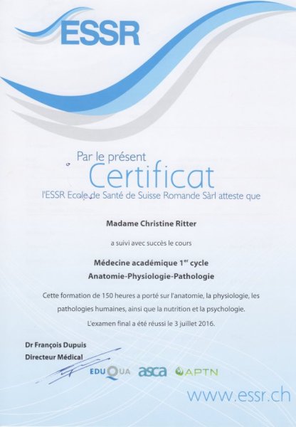 Après l'obtention d'une Licence ès Lettres (Master of Arts) en littératures allemande et française, ainsi que d'un Master en enseignement, j'ai choisi il y a quelques années d'entreprendre en complément plusieurs formations dans le domaine des médecines alternatives. J'ai ainsi obtenu plusieurs titres, notamment en hypnose ericksonienne, en PNL, en homéopathie et en médecine académique.