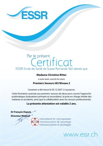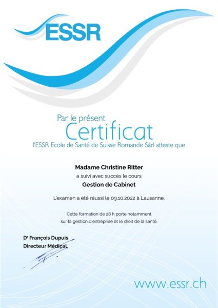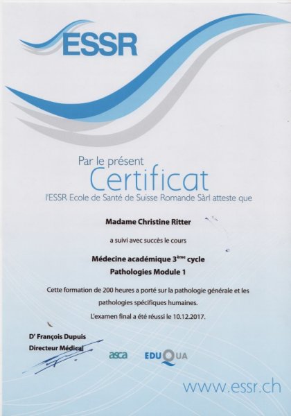 - 2021: Certificat et examen de médecine académique, Ecole de Santé de Suisse Romande, reconnue par l'ASCA et le RME