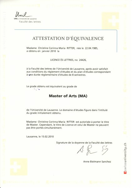 - 2010: Master ès Lettres (Littératures allemande et française, Sciences politiques)