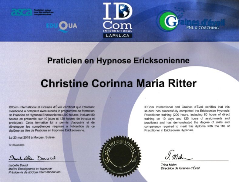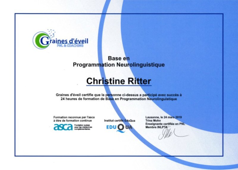 J'ai suivi ma formation en hypnose et PNL chez "Graines d'éveil" avec Trina Mohn et Isabelle David.